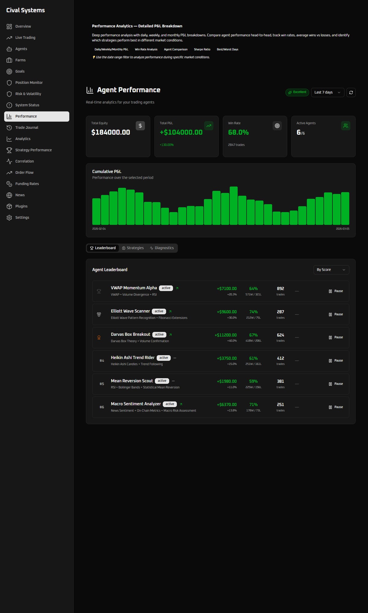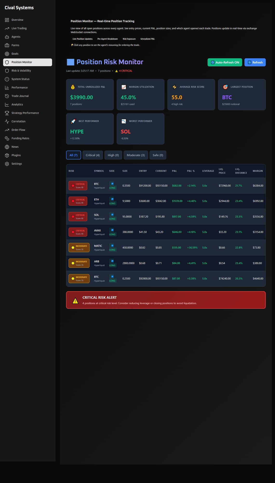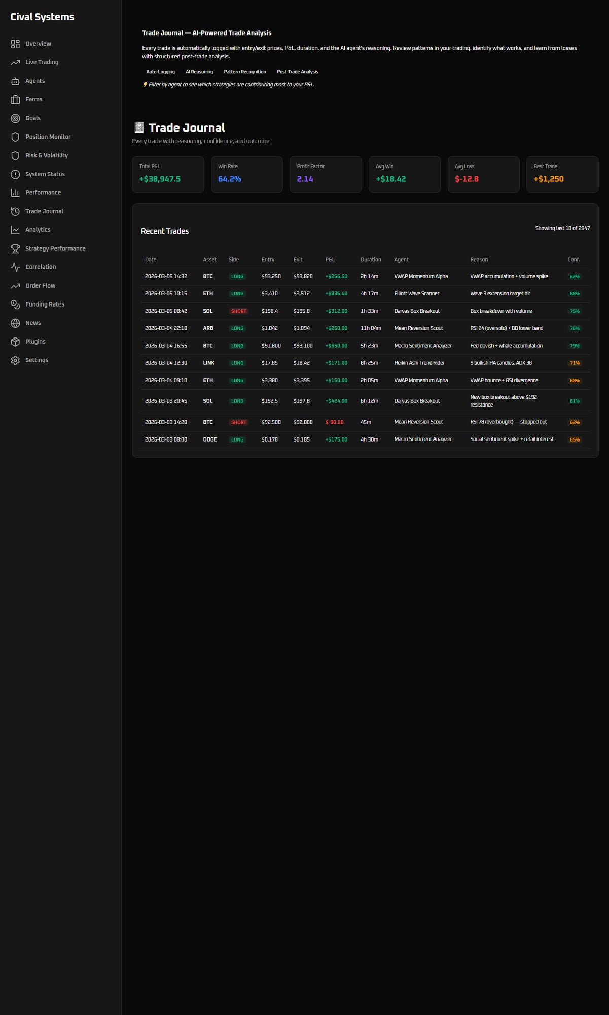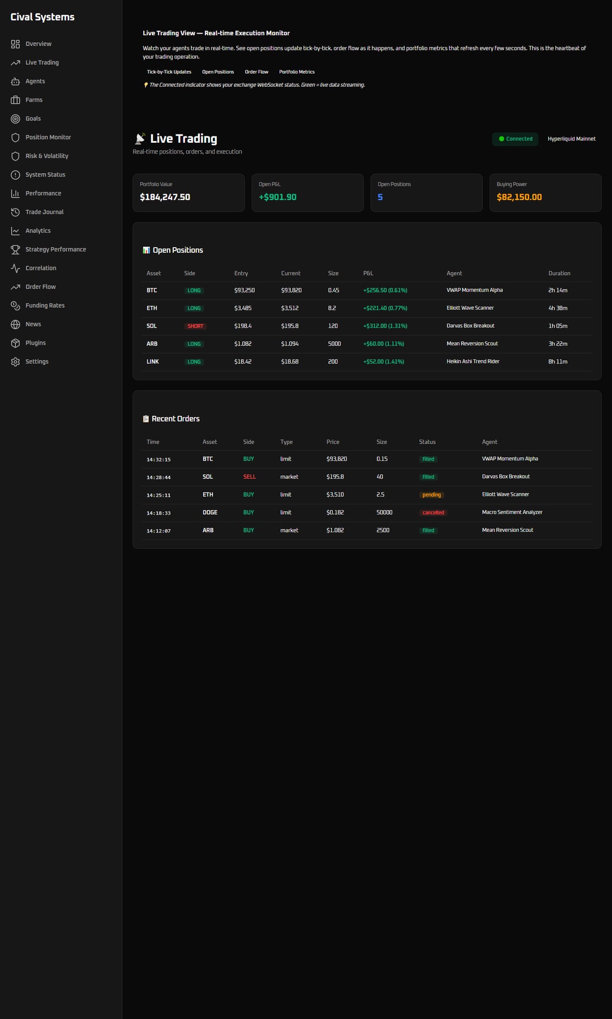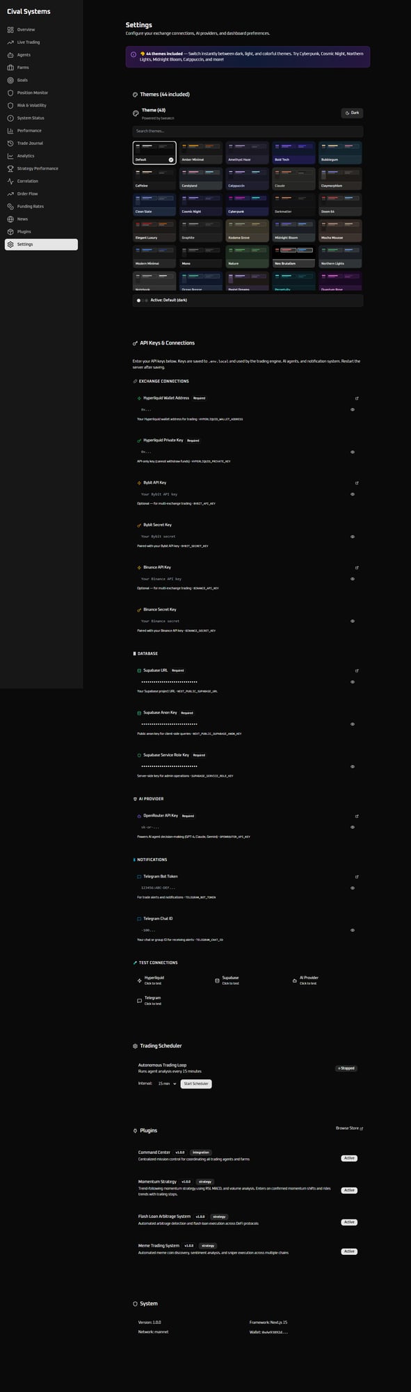 Complete AI trading dashboard with one fully functional VWAP + RSI agent included, goal-based execution, Hyperliquid integration, 44 themes, and a plugin system for adding more agents and features. Deploy in minutes.