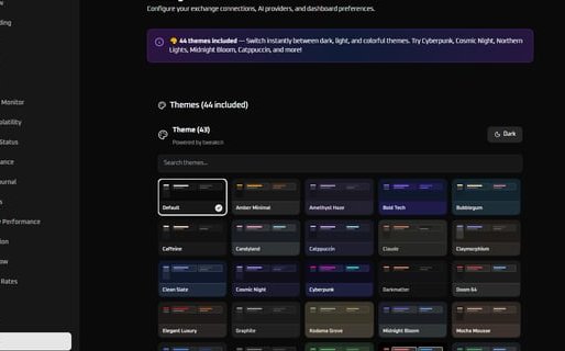 Choose from 44 professionally designed themes ā from Cyberpunk and Cosmic Night to Clean Slate and Mocha Mousse. Switch instantly or build your own. Need a branded look for your fund? We offer custom theme design as a service.