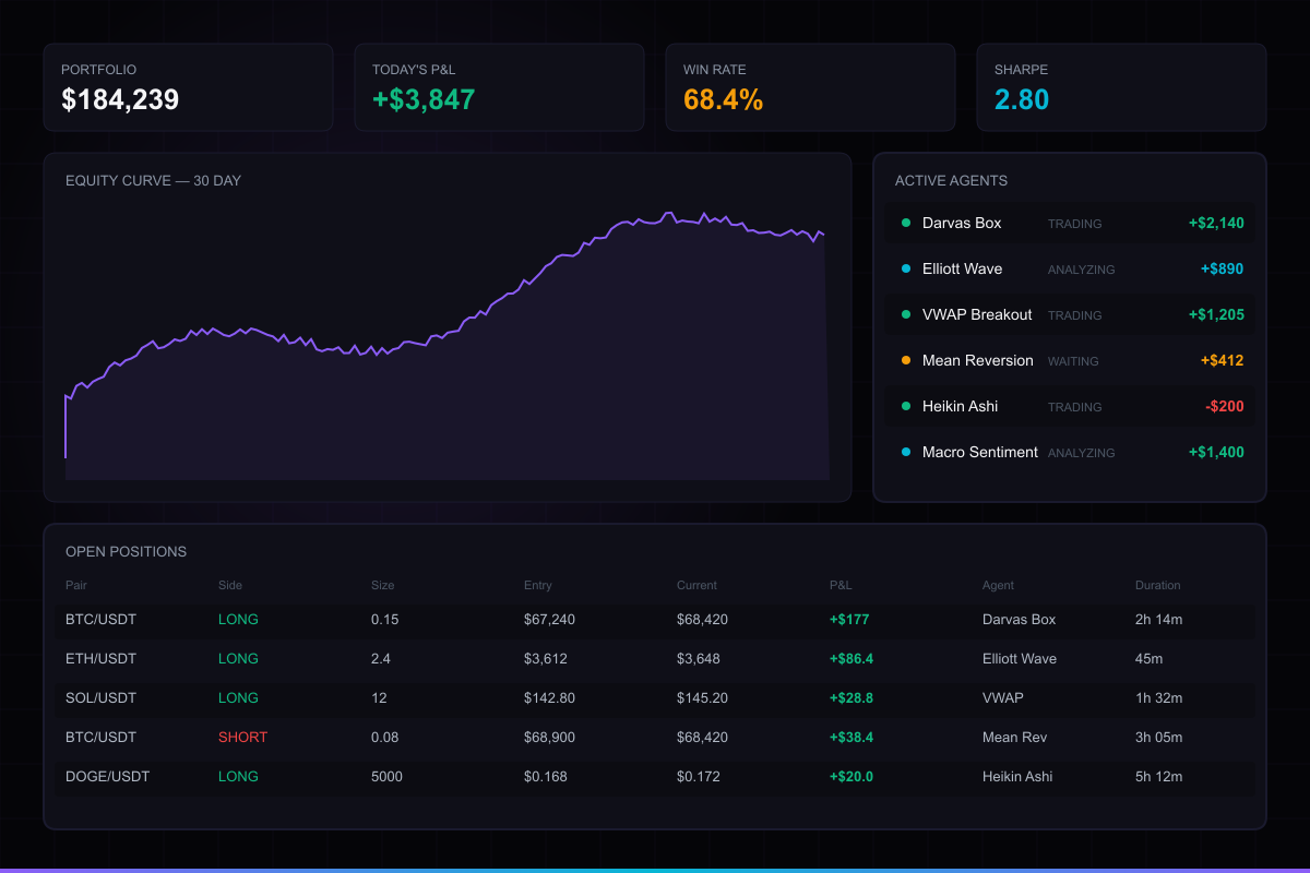 Want more strategies? Add premium agents (Darvas Box, Elliott Wave, Heikin Ashi, Mean Reversion, Macro Sentiment) from our store. Each one plugs directly into the dashboard.
